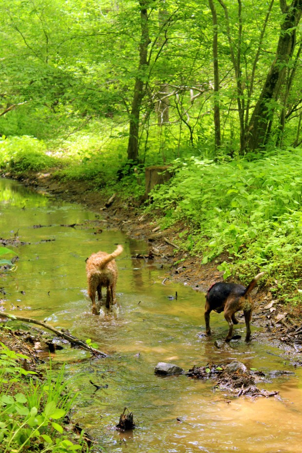 About a month ago, we had a weekend at a cabin with my brother and his family. They brought their beagle along, and the two dogs had fun playing and romping in the woods for the weekend! We took them and the children that were along on a creek walk. It got a bit (ok, very) muddy, but it was worth it!